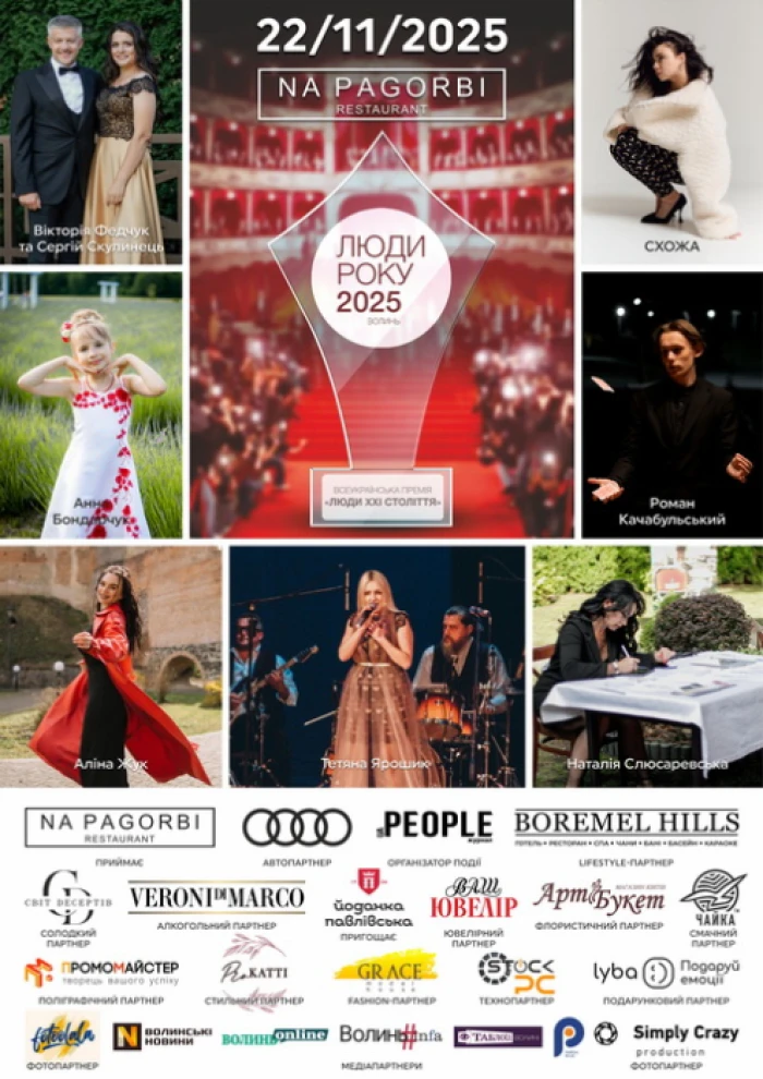 22 листопада 2025 року у ресторані Na Pagorbі відбудеться десята ювілейна церемонія нагородження Премією «Люди Року-2025. Волинь» у рамках програми «Люди XXI століття», приурочена Дню Гідності та Свободи.