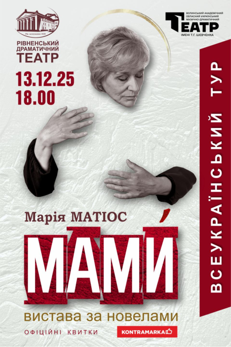 У Волинському академічому обласному українському музично-драматичному театрі імені Тараса Шевченка 13 грудня відбудеться унікальна подія – показ вистави «МАМИ́» Рівненського драматичного театру — масштабної постановки, створеної за мотивами збірки новел Марії Матіос. Це Всеукраїнський проєкт, адже театр має на меті об’їхати з постановкою усі міста України, де є драматичні театри.
