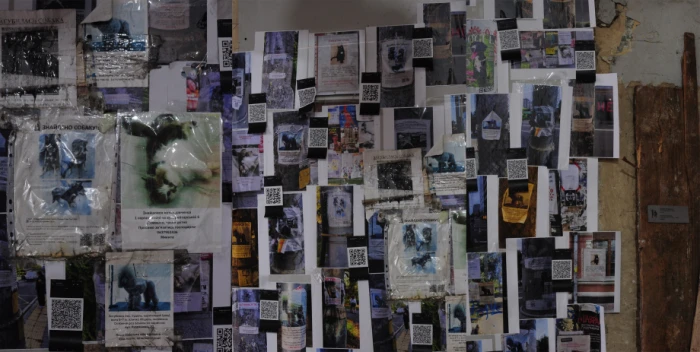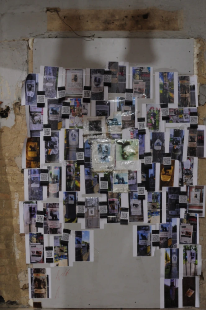 Колаж утворений у просторі Будинку Офіцерів, складається із оголошень загублених/знайдених домашніх тварин зроблених на мобільний автора у Києві, та роздрукованих на папері А4 формату (53 од.), 4 справжніх оголошення із Києва, скрінів з мобільного телефону автора, що містять qr коди, які ведуть на інстаграм ПРИТУЛКУ ДЛЯ ХВОСТАТИХ | МИКОЛАЇВ та на банку для благодійних донатів (qr коди надала Марія Горшкова), роздруковані скріни (24 одиниці) відповідають реальному розміру мобільного автора.