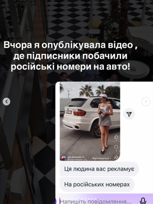 На своїй сторінці в Інстаграм інфлюенсерка опублікувала відео, на якому вона виходить з білого автомобіля, на якому російські номерні знаки.