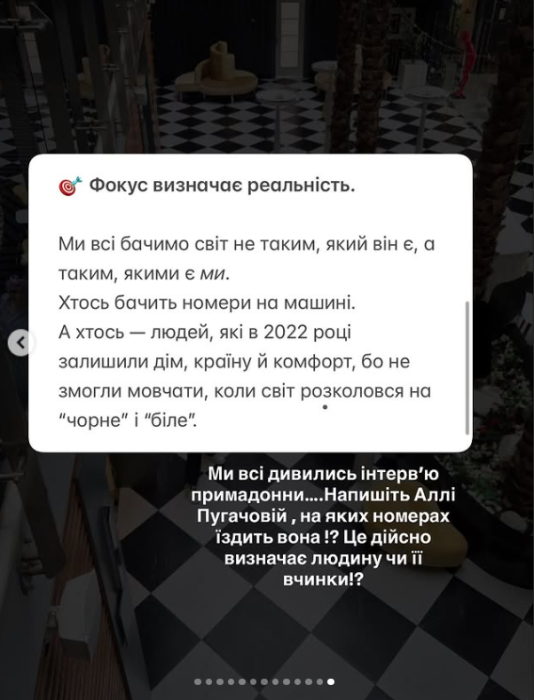 Бо номери не визначають цінності. Вчинки — визначають. Ми бачили інтерв’ю Алли Пугачової і її позицію, цікаво на яких номерах її автівка!? Відео забрала, хоча справді міг бути темний піар, та я за чесність і любов!