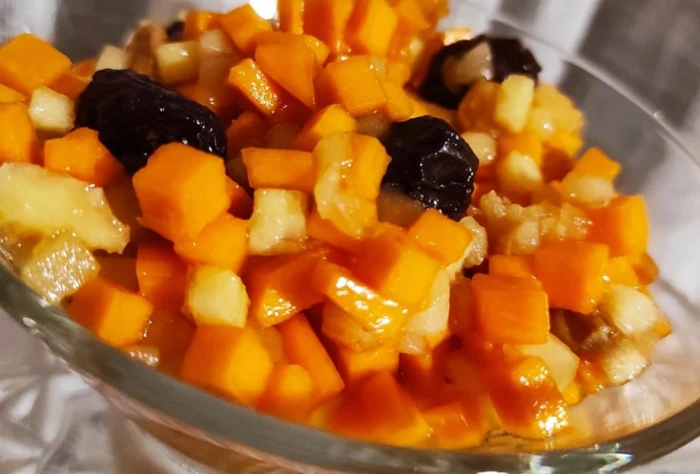 Родзинки залити окропом і залишити, щоб набрякли. Горіхи трохи підсушити і подрібнити. Гарбуз і яблука почисти і порізати дрібними кубиками.