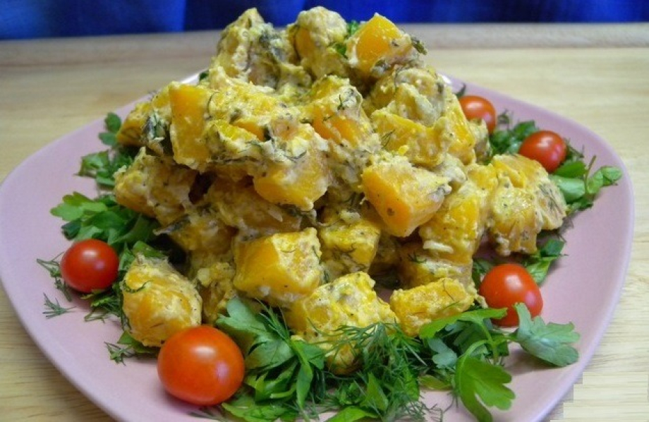 Гарбуз почистити від шкірки і насіння, нарізати великими кубиками. Обсмажити на олії на сильному вогні до золотистої скоринки. сметану змішати дрібно посіченою зеленню, подрібненим часником, посолити, поперчити, додати паприку і змішати зі сметаною. Соус додати до гарбуза, перемішати і тушкувати під кришкою 5-7 хв. Гарбуз має стати м’якими, але не розваритися.