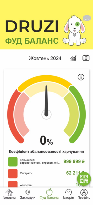 У мобільному додатку DRUZI, що працює в обох мережах, з’явився новий розділ «ФудБаланс». Це персональний аналізатор кошика покупок. Механіка його роботи дуже проста: система аналізує придбані товари та класифікує їх на «корисні» та «ті, що варто вживати рідше». На основі цих даних формується індивідуальний «Коефіцієнт збалансованості харчування», який наочно відображається на зручній кольоровій шкалі. Так, чим більше гість купує корисних продуктів, тим вищий його баланс здорового харчування.