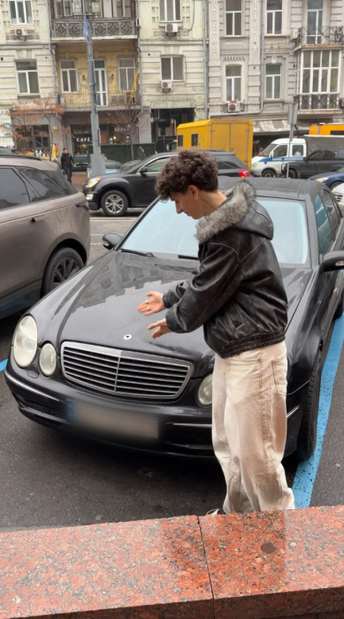 Невідома жінка у центрі Києва зірвала емблеми з Mercedes артиста.