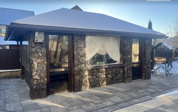 Подвір'я по периметру вимощене бруківкою. Тут знаходиться задній двір із зоною барбекю, закритою альтанкою та хатинкою для апітерапії релаксу та відновлення енергії, та басейн із полікарбонатним накриттям, системою фільтрації, що зберігає чистоту й комфортну температуру води.